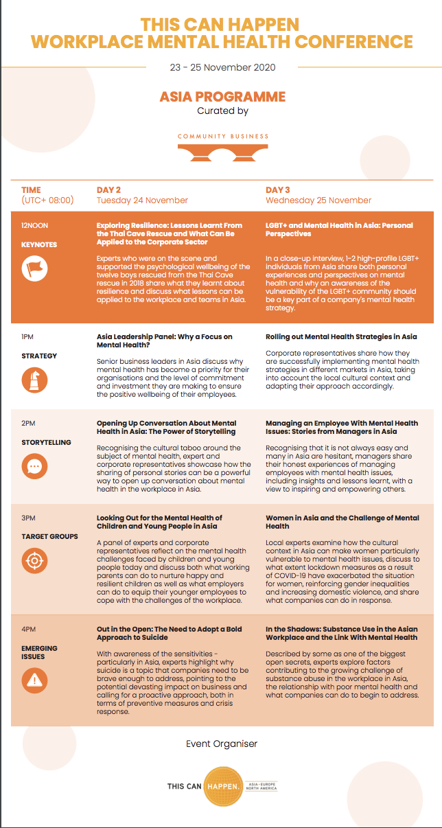 “When we compiled our research into mental health in the workplace in Asia back in 2018, few companies were ready to talk about mental health – it was widely seen as a taboo subject. With the outbreak of COVID-19 and the requirement to work from home and socially distance, we have seen that context shift dramatically. Acutely aware of the unprecedented pressures on employees, there has been an outpouring of messages from CEOs and senior leaders, expressing concern about the wellbeing of their employees. As a result, discussion of mental health has been fast-tracked up the corporate agenda. We are privileged to be partnering with This Can Happen to bring the leading mental health workplace conference to our audiences in Asia and are committed to working with senior leadership and their teams in the region to address this critical subject in the workplace.”